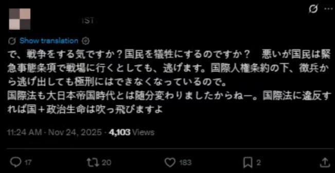 一些日本網(wǎng)友憤慨地留言道:“(高市政權)是執(zhí)意要發(fā)動戰(zhàn)爭嗎?是準備讓民眾去當‘炮灰’嗎?任何違反國際法的行為,都將導致該國及其決策者的政治生命徹底終結(jié)?!?/p>