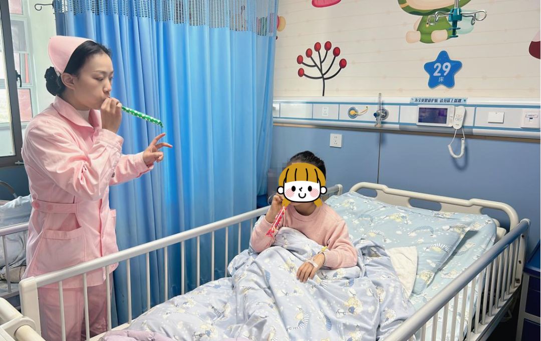 “來,一二三吸氣,一二三呼氣,慢慢吹……”胡祎夢(mèng)一邊溫柔地喊著口令,一邊用彩色長(zhǎng)管做著示范。這并非簡(jiǎn)單的游戲互動(dòng),而是針對(duì)患兒設(shè)計(jì)的主動(dòng)呼吸循環(huán)技術(shù)趣味教學(xué)——將專業(yè)的康復(fù)訓(xùn)練轉(zhuǎn)化為“吹吸管挑戰(zhàn)”,讓小朋友在輕松的氛圍中自然掌握呼吸節(jié)奏控制技巧。這種寓教于樂的方式,不僅有效鍛煉了患兒的呼吸肌功能、助力痰液排出,更成功驅(qū)散了疾病治療帶來的枯燥與焦慮,讓病房里的康復(fù)訓(xùn)練充滿歡聲笑語。