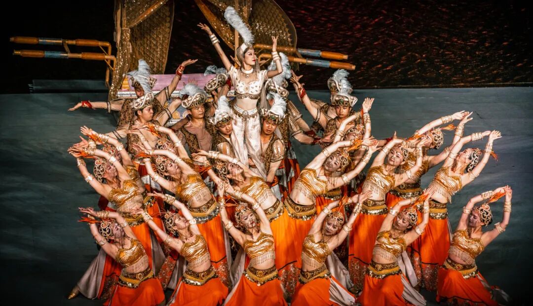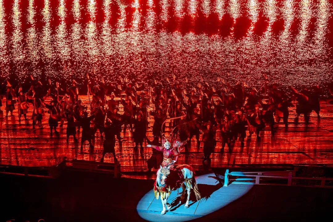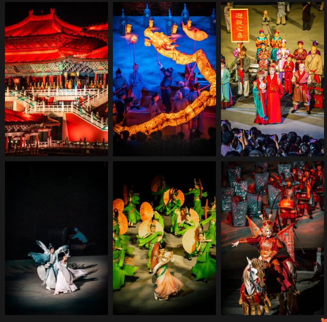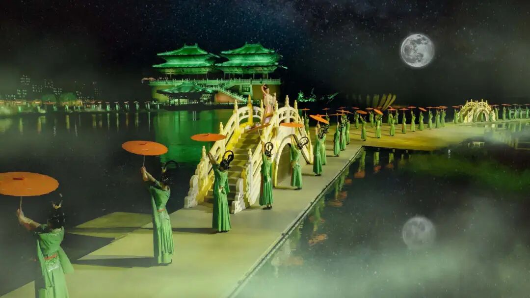 整場(chǎng)演出運(yùn)用大量的科技手段制造出夢(mèng)幻般的效果,將精心選擇的歷史畫(huà)面包含進(jìn)去,把人們的記憶拉向1000多年前的那個(gè)輝煌朝代。