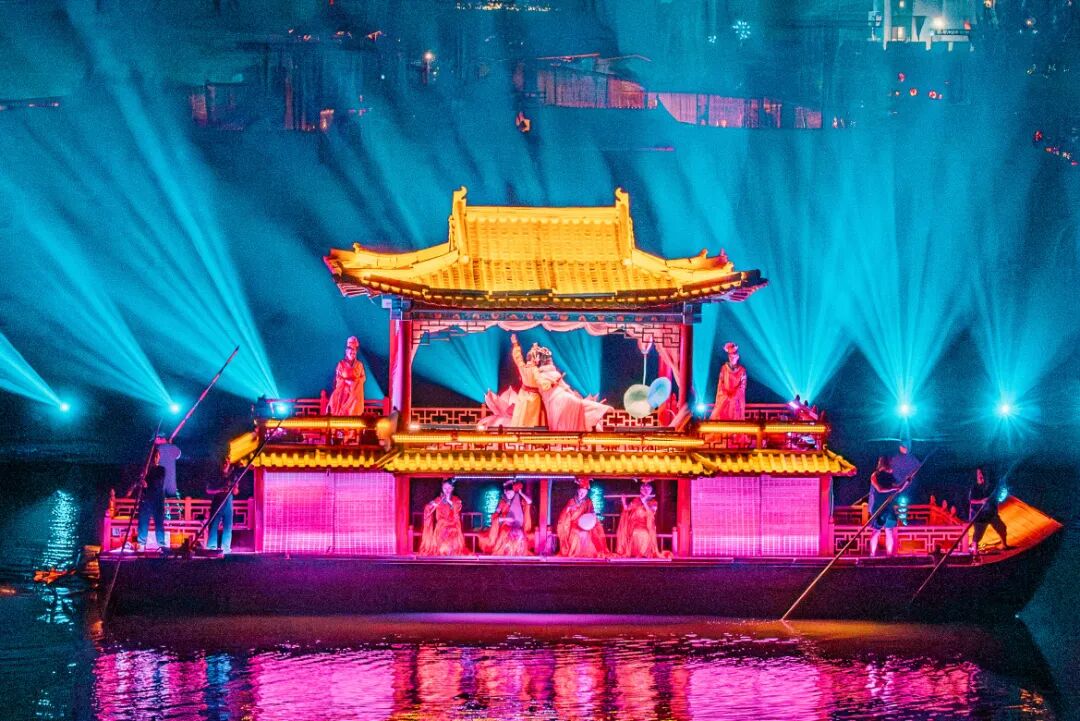 大型水上實(shí)景演出《大宋·東京夢(mèng)華》由清明上河園斥巨資打造,充分利用皇家園林區(qū)景龍湖附近的亭臺(tái)樓閣、水榭橋廊構(gòu)成一個(gè)完整的古典實(shí)景劇場(chǎng)。
