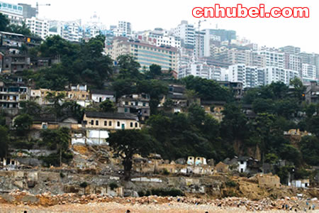 截?cái)辔咨皆朴辏邖{出平湖。再過(guò)兩天,承載著億萬(wàn)中國(guó)人夢(mèng)想的三峽大壩135米蓄水就將開(kāi)始,長(zhǎng)江三峽一些人們熟悉的景觀將從此沉睡在煙波浩淼的高峽平湖之中。(左圖—)豐都老城廢墟上,一名婦女正逗孩子玩。遠(yuǎn)處是高樓林立的新縣城。