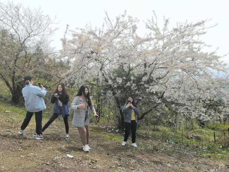 來自湖北大學(xué)藝術(shù)學(xué)院、中南民族大學(xué)美術(shù)學(xué)院、湖北美術(shù)學(xué)院等高校的師生一行登上大幕山山頂,欣賞遍地野櫻花,俯瞰綿綿山谷,大家對(duì)這里的風(fēng)景贊不絕口,紛紛拍照留念。
