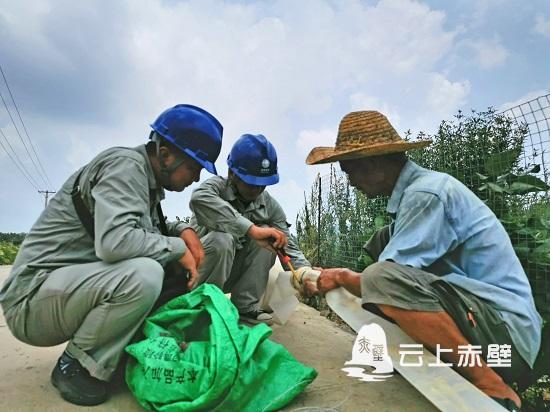 田紅云朋友圈中的這位微信好友是赤壁市供電公司的黨委書記余柒明。在得知斗門村農(nóng)田出現(xiàn)干旱的基本情況后,余柒明立即組織車埠供電所“星火”黨員志愿服務(wù)隊的志愿者們趕到現(xiàn)場勘查旱情,在向農(nóng)戶了解抽水灌溉的實際困難后,他們頂著高溫,將低壓線路引至遠(yuǎn)處的水源地,裝設(shè)電能表、漏電保護(hù)器、連接抽水泵,經(jīng)過一個多小時的作業(yè),讓水嘩啦啦流入了農(nóng)戶干涸的農(nóng)田。
